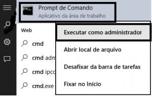 Para gerenciar usuários via linha de comando precisamos de privilégios administrativos, para isto abra o menu iniciar e chame o prompt de comando como administrador como mostra a tela abaixo.