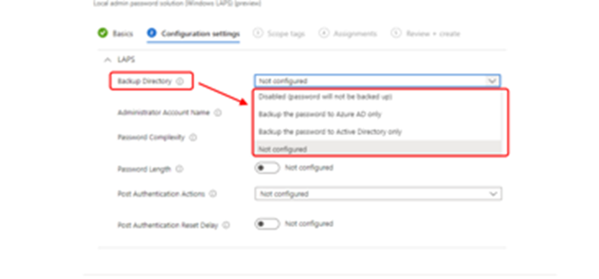 Figura 1 — Definição do Backup Directory em uma política de Windows LAPS no Intune.